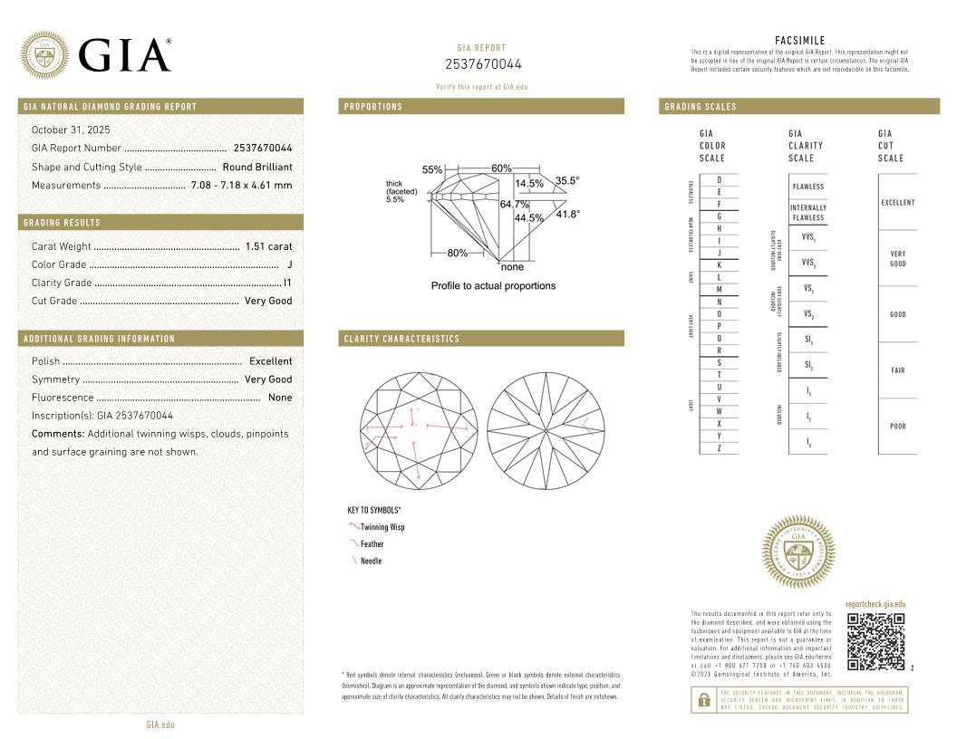 1.51 Carats, Round Diamond with Very Good Cut, J Color, I1 Clarity and Certified by GIA
