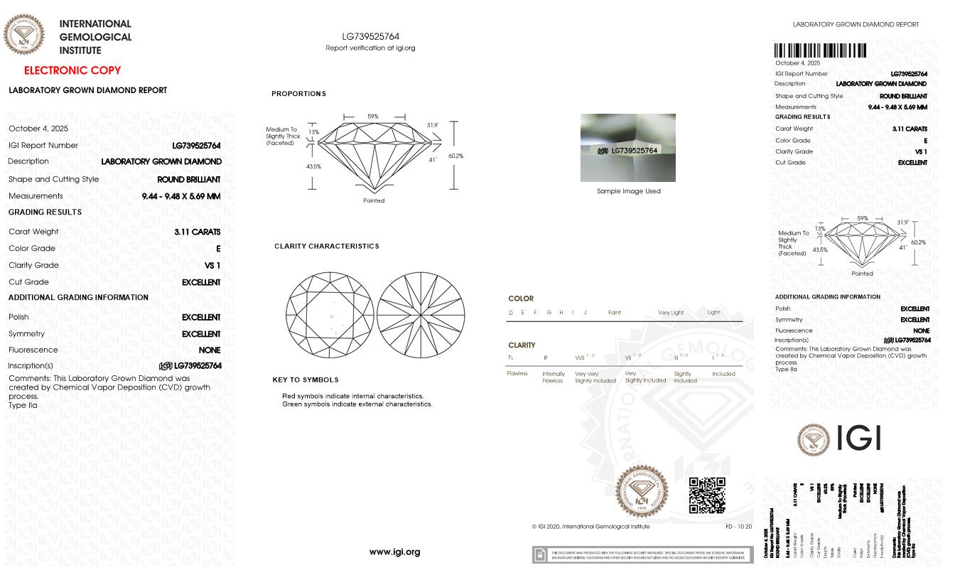 Del inventario de diamantes de laboratorio, 3.11 quilates, Redondo , Color E, claridad VS1 y certificado IGI