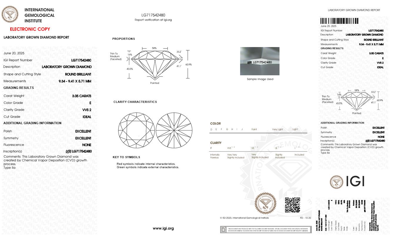 Del inventario de diamantes de laboratorio, 3.04 quilates, Redondo , Color E, claridad VVS2 y certificado IGI