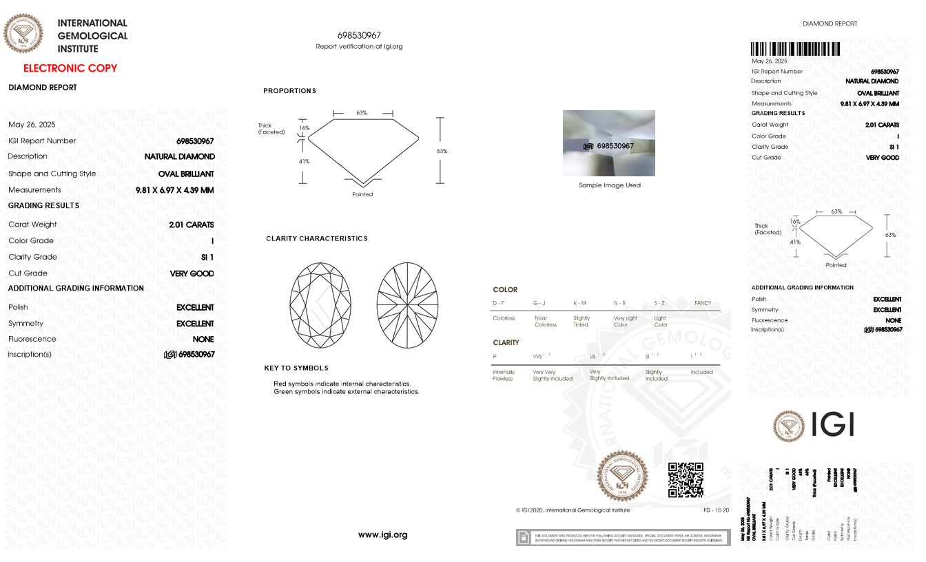Natural Diamond 2.01 Carats, Oval with  Cut, L Color, VVS2 Clarity and Certified by IGI