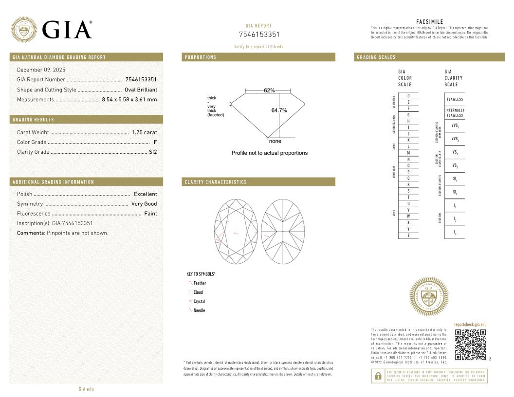 1.20 Carats, Oval Diamond with  Cut, F Color, SI2 Clarity and Certified by GIA