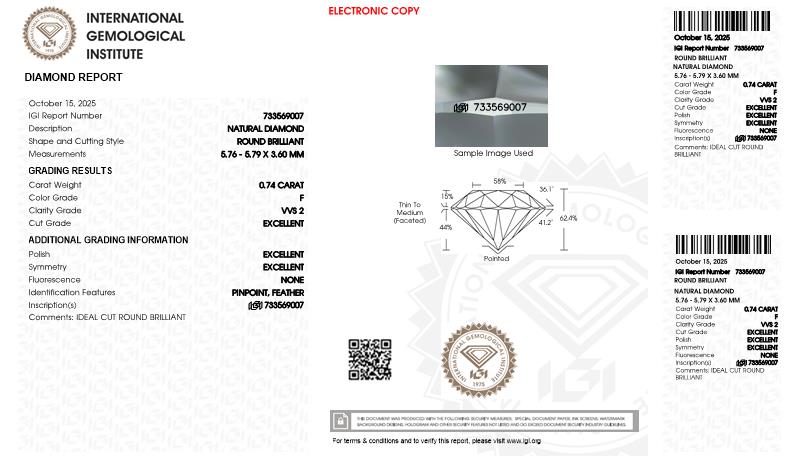 Natural Diamond 0.70 Carats, Round with Excellent Cut, E Color, VS2 Clarity and Certified by IGI