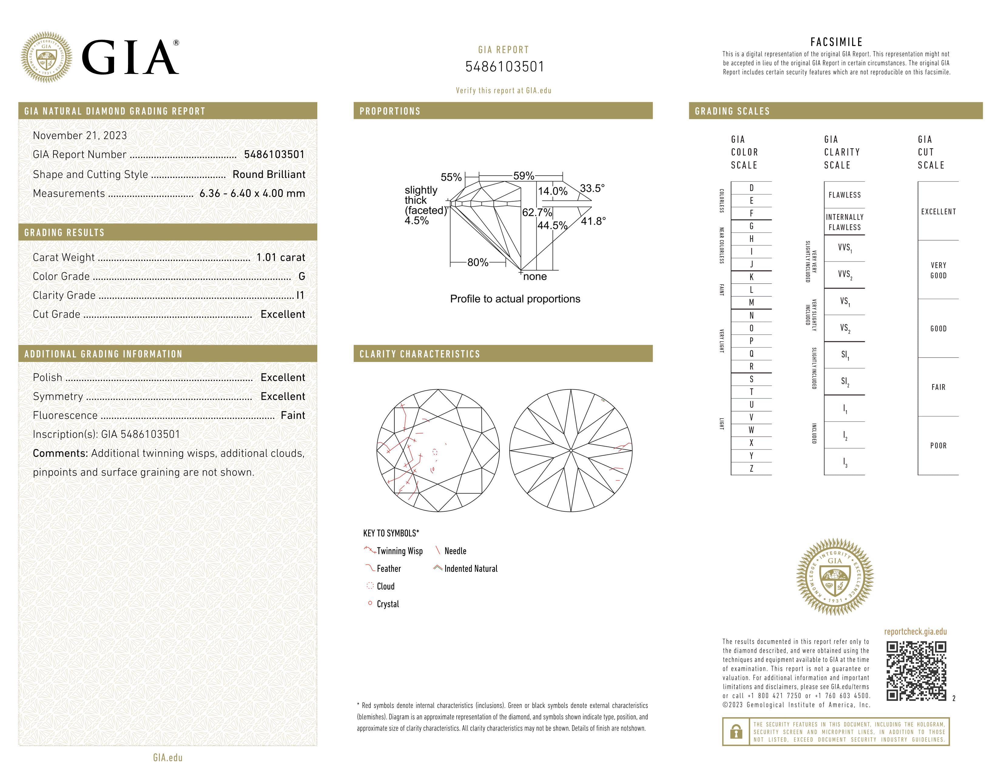 1.01 Carats, Round Diamond with Excellent Cut, G Color, I1 Clarity and Certified by GIA