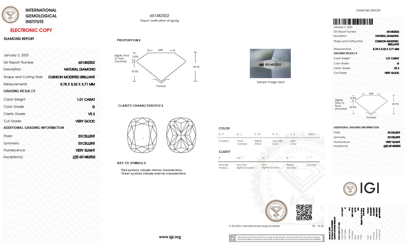Natural Diamond 1.01 Carats, Cushion with  Cut, J Color, VVS2 Clarity and Certified by IGI
