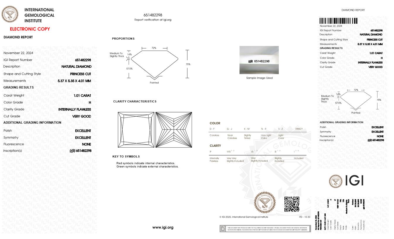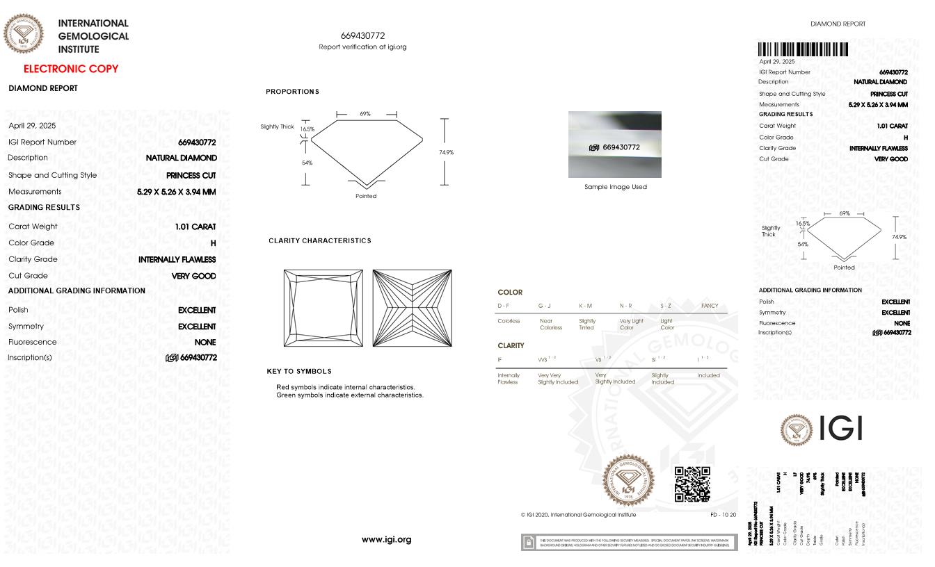 Natural Diamond 1.03 Carats, Princess with  Cut, I Color, VVS2 Clarity and Certified by IGI